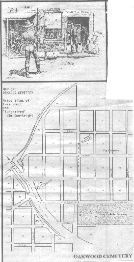 In several accounts that I have read about the burial places of Luke Short and Longhair Jim Cartwright, it is stated that they are buried just a stones' throw away from each other. Well, I went back to Oakwood Cemetery and measured that stones' throw. and it is 555 feet from grave to grave almost as the crow flies. I went out and found me a rock and threw it and measured how far it went. It went 69 feet.I then divided 69 feet into 555 feet and came out with eight stones throws. I rest my case. I didn't throw the rock in the cemetery as I didn't think that would look to good. |