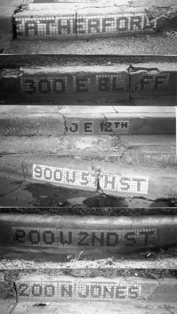 THROUGHOUT FT. WORTH many streets have the mosaic tile street signs on the curbs. Around 1935