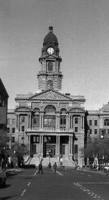 The courthouse is a four story building of red granite in